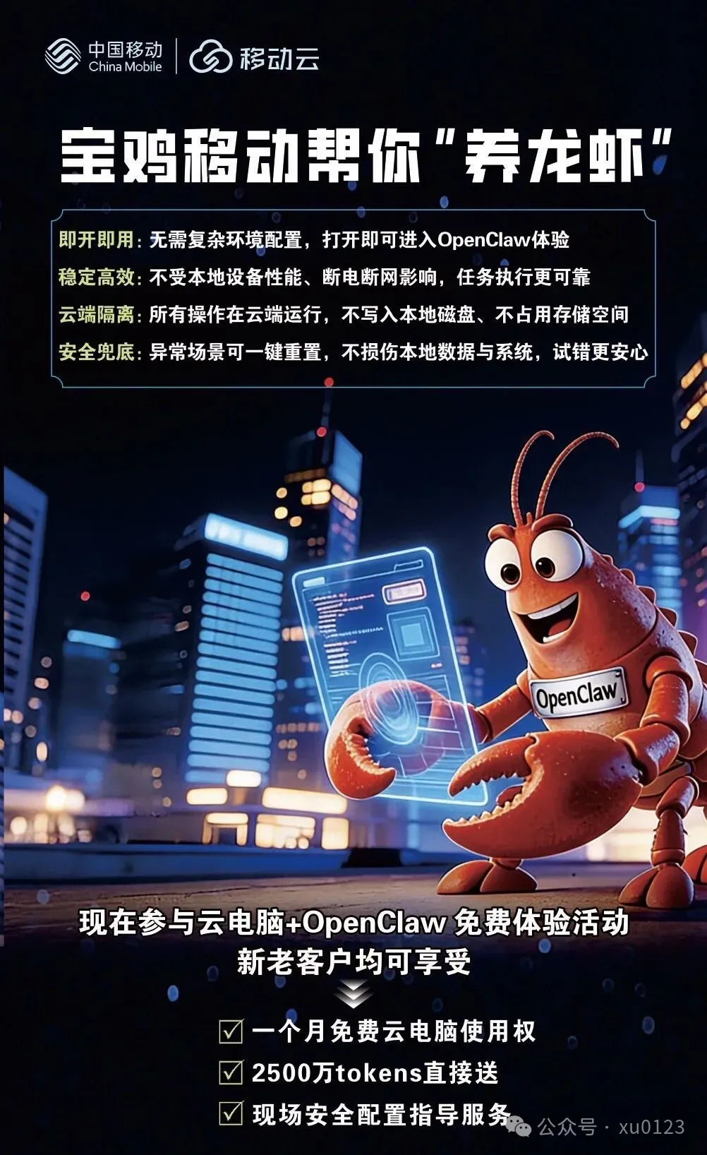 移动云专业技术团队,为您免费安装“龙虾”,小白也能一秒开养,还送 2500 万免费 Tokens,真正实现零成本拥有专属 AI 小龙虾,打工人、学生党闭眼冲就对了!