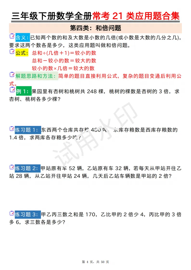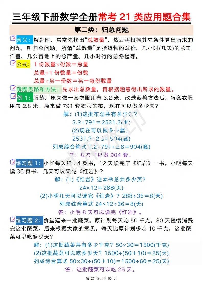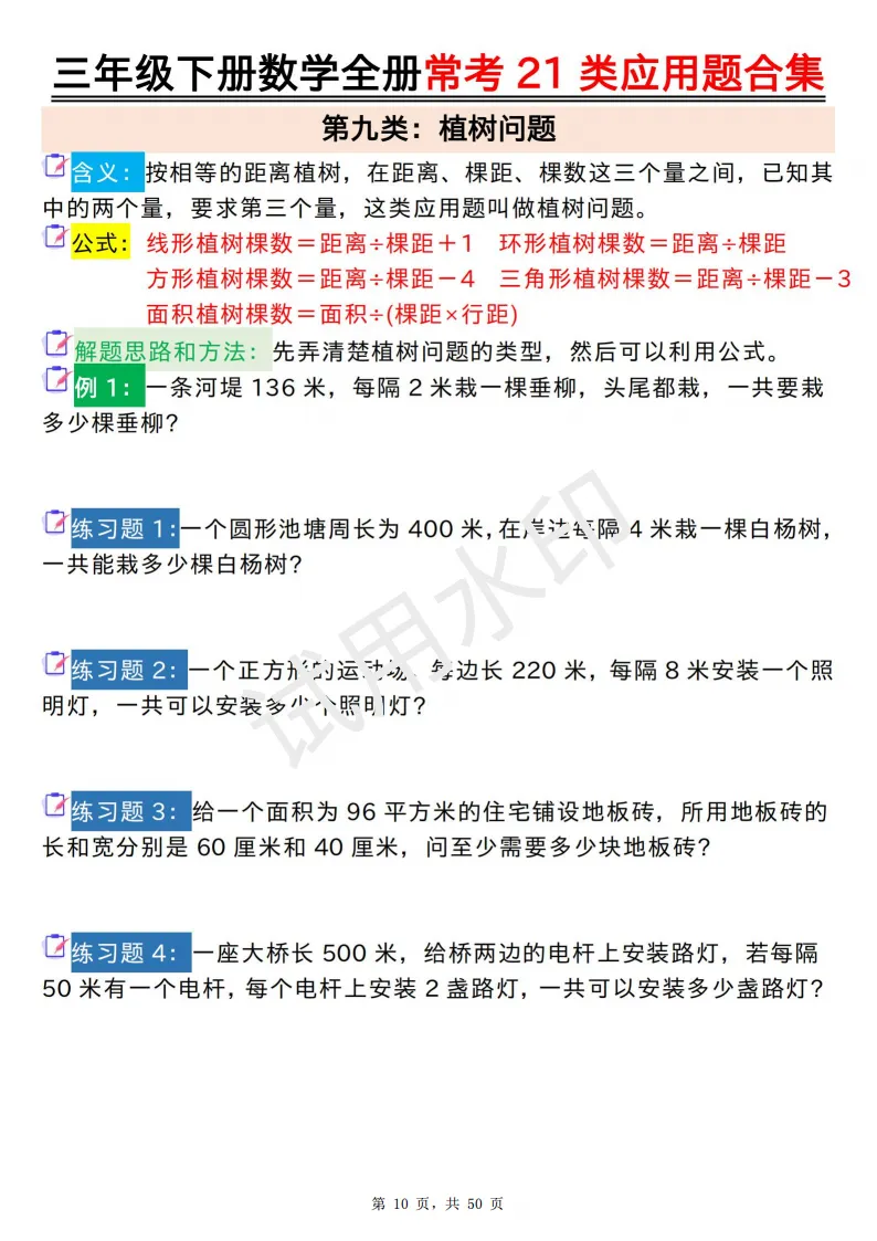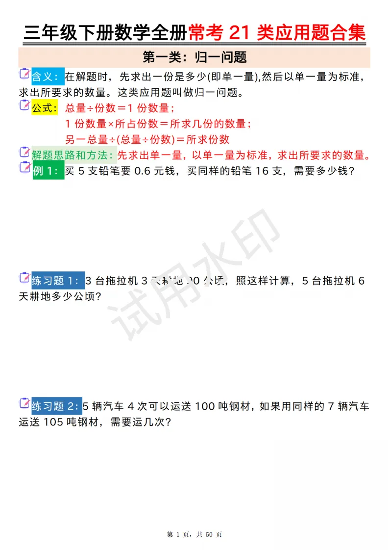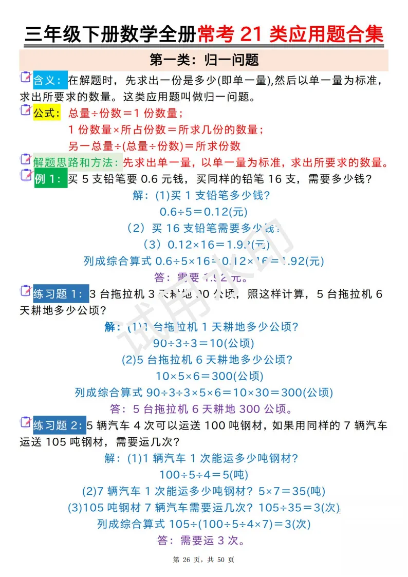 今天给大家分享的是:2026年春人教版三年级下数学全册常考21类应用题及答案合集(共50页,高清PDF电子版可打印。完整电子版文章末尾可直接领取,无套路,欢迎收藏和下载。