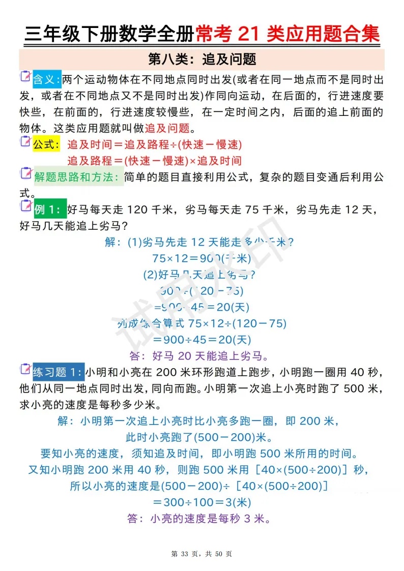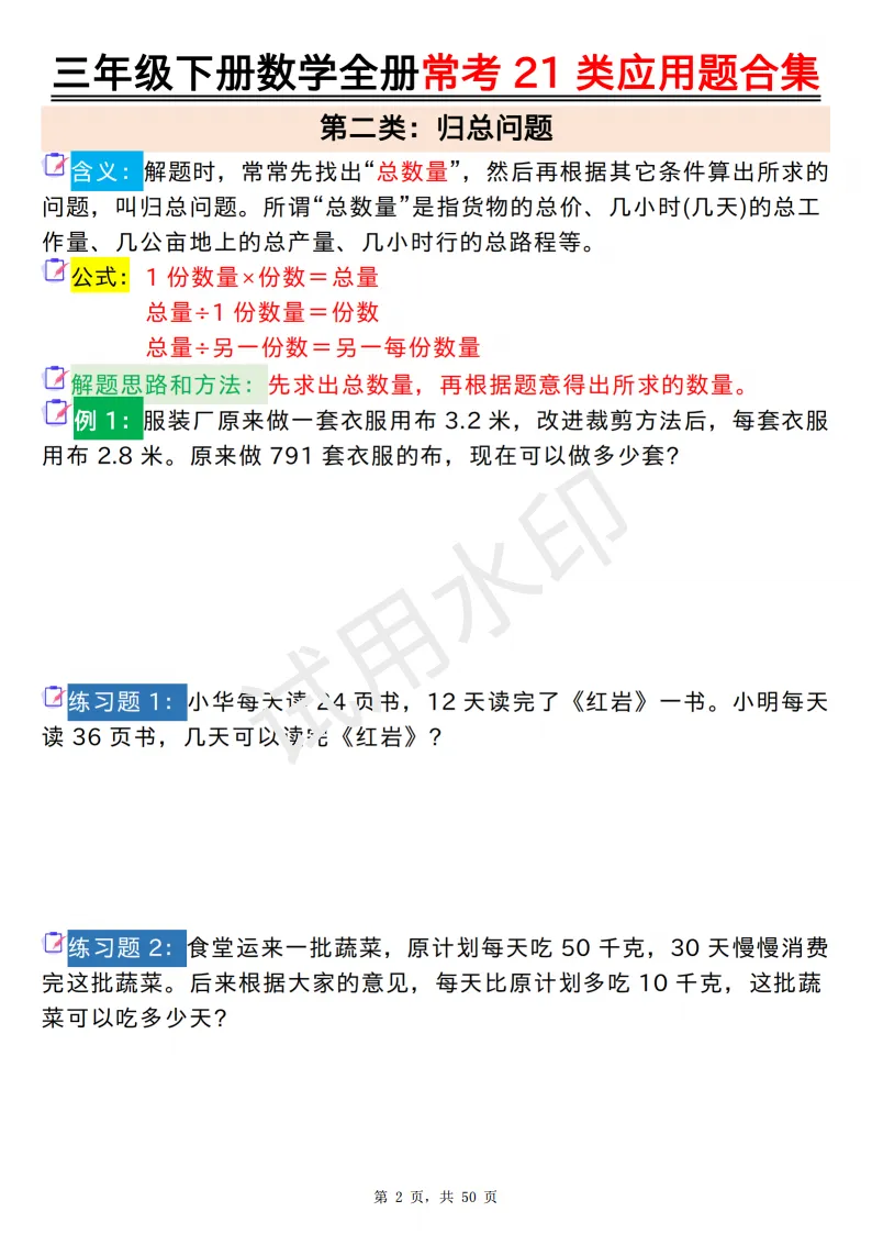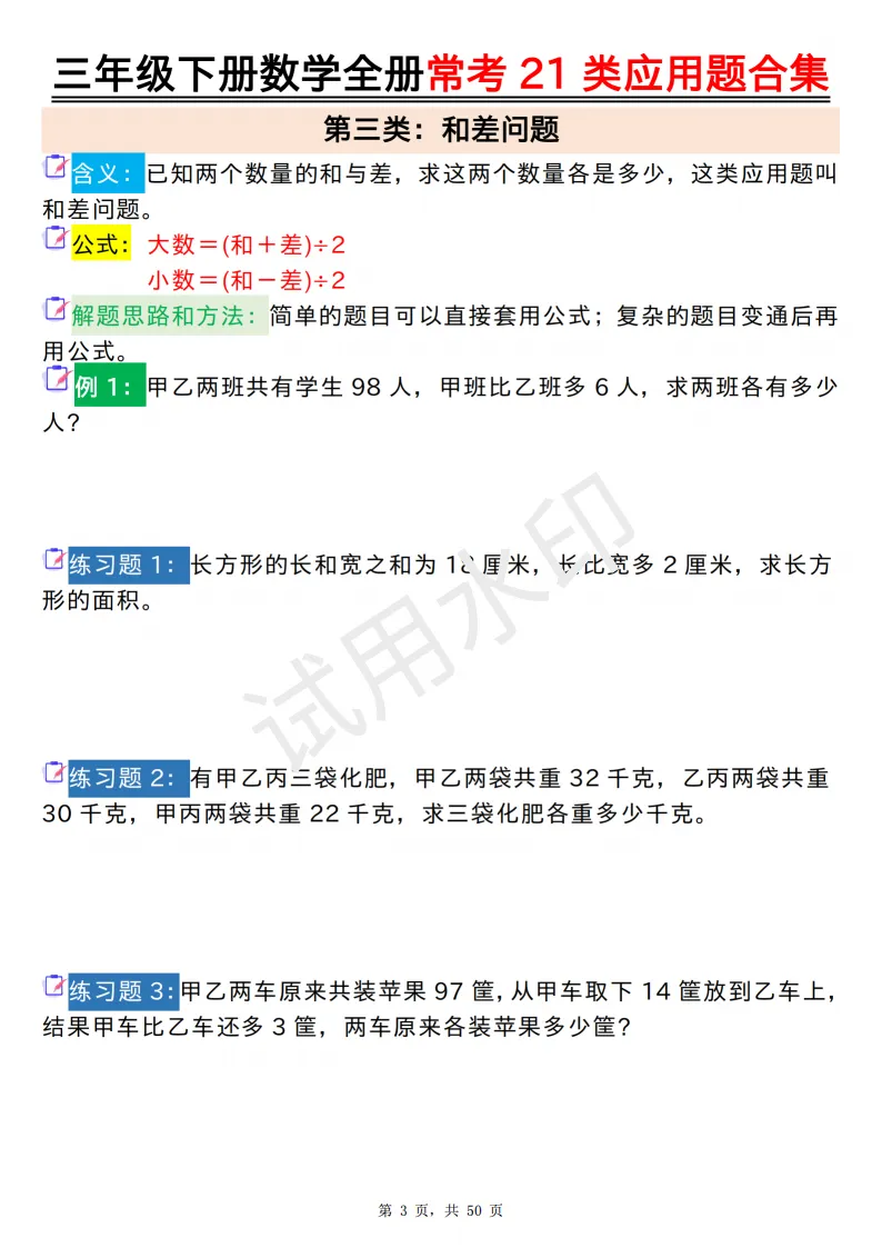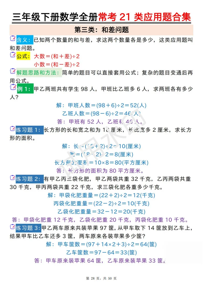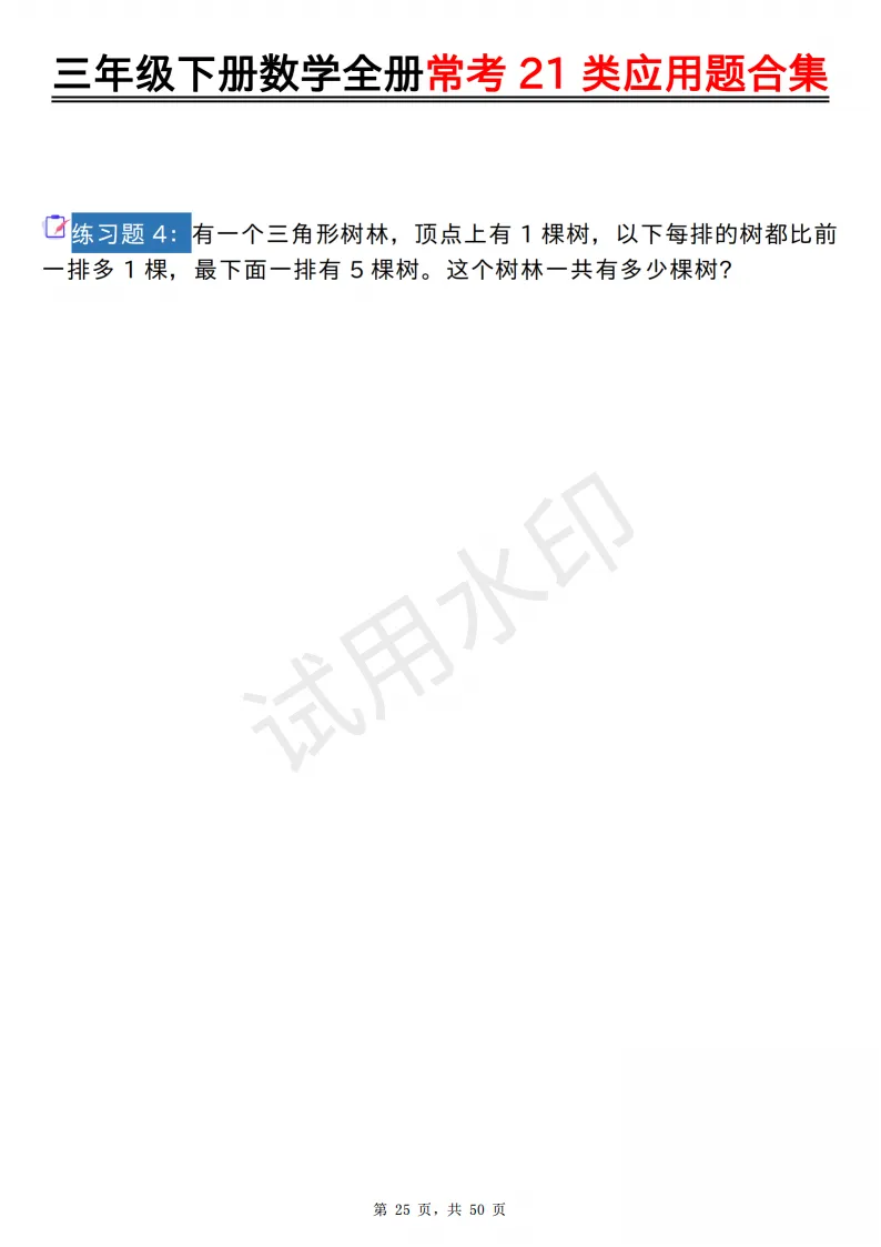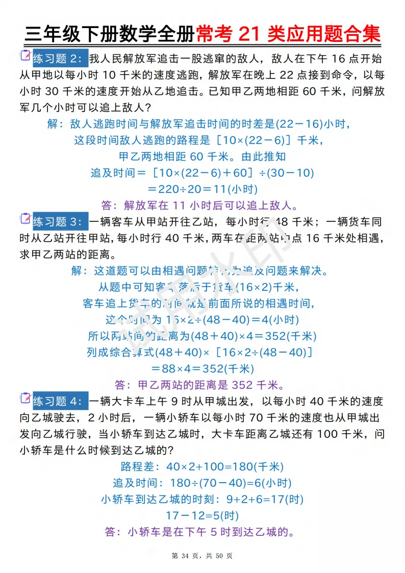 今天给大家分享的是:2026年春人教版三年级下数学全册常考21类应用题及答案合集(共50页,高清PDF电子版可打印。完整电子版文章末尾可直接领取,无套路,欢迎收藏和下载。