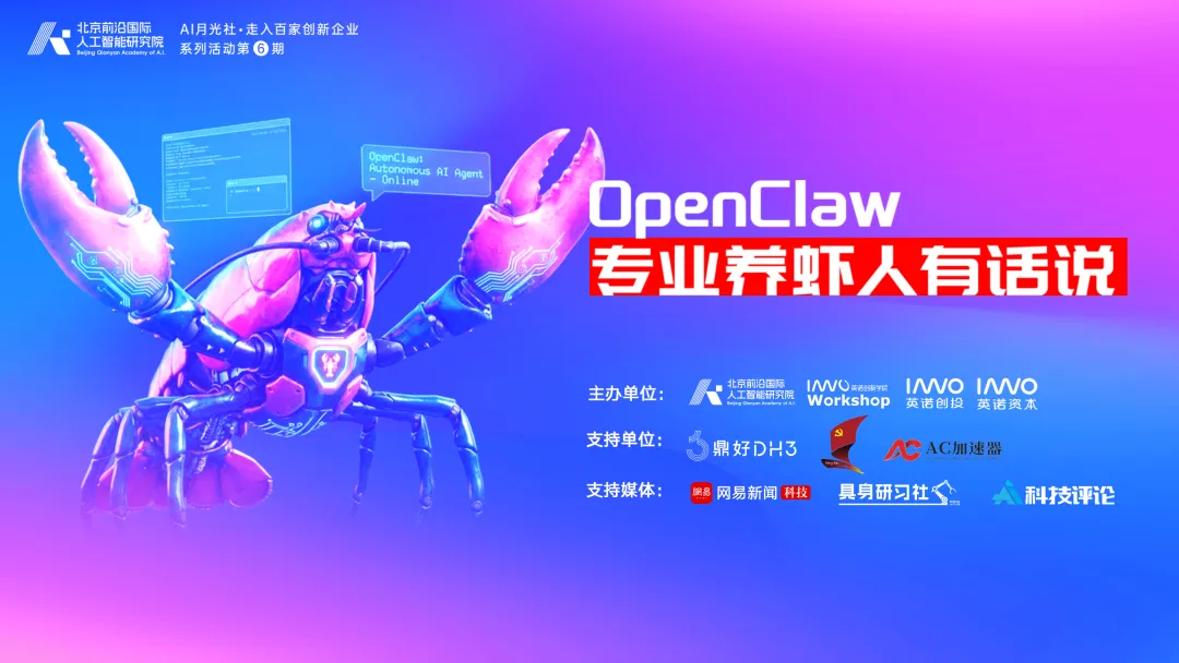 3月18日,北京前沿国际人工智能研究院AI月光社系列活动第6期“OpenClaw 专业养虾人有话说”在鼎好人工智能创新中心成功举办。活动紧扣当下AI技术发展热点,聚焦产业落地应用、人类价值定位等核心议题,吸引线上近100人,线上15000+人次观看。