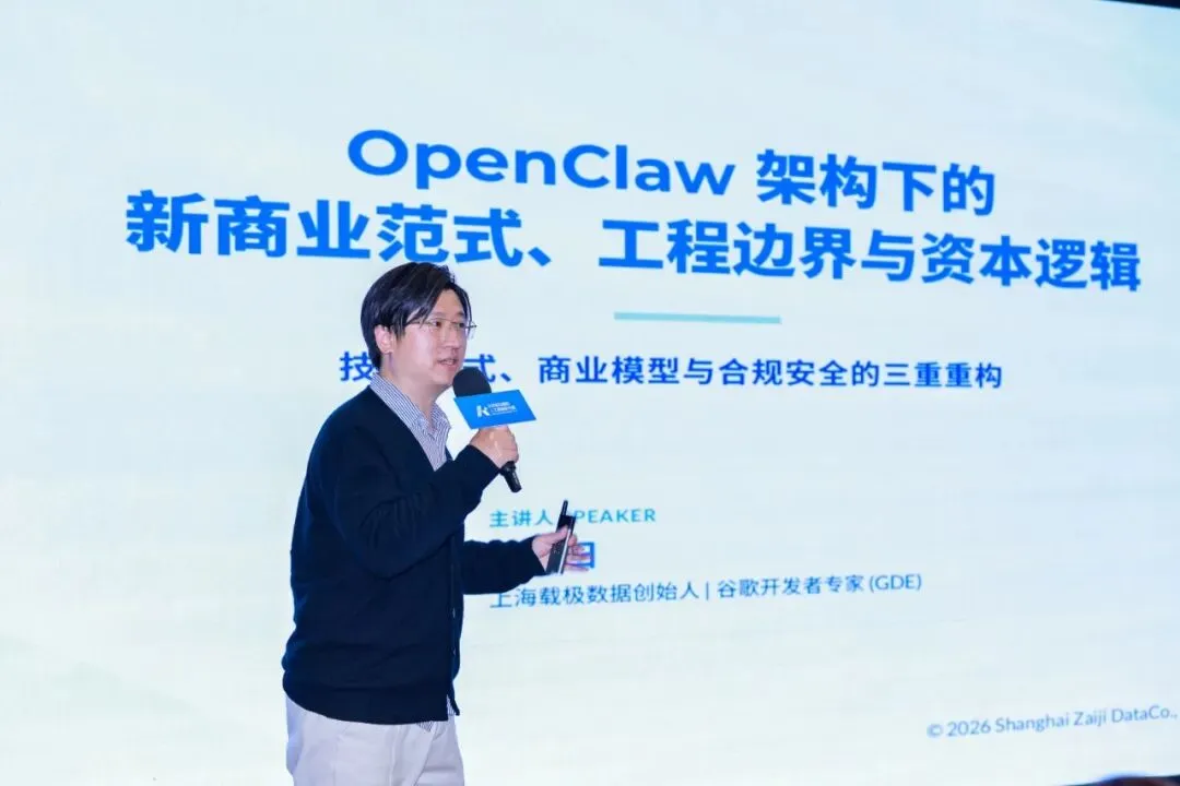随后,上海载极创始人、谷歌开发者专家(GDE)彭靖田带来《OpenClaw架构下的新商业范式、工程边界与资本逻辑》主题分享,聚焦AI技术范式迁移与产业落地实践,结合自身深耕AI领域的经验,深入解析“龙虾”的技术核心与应用逻辑。彭靖田指出,“龙虾”的出现并非简单的技术升级,而是引发了人工智能领域的重大范式变革,其核心突破在于实现了AI的拟人化升级——通过网关控制、记忆持久化、物理世界知情权等核心设计,让AI摆脱了“单纯工具”的定位,转变为可与人类高效协作的“伙伴”。
