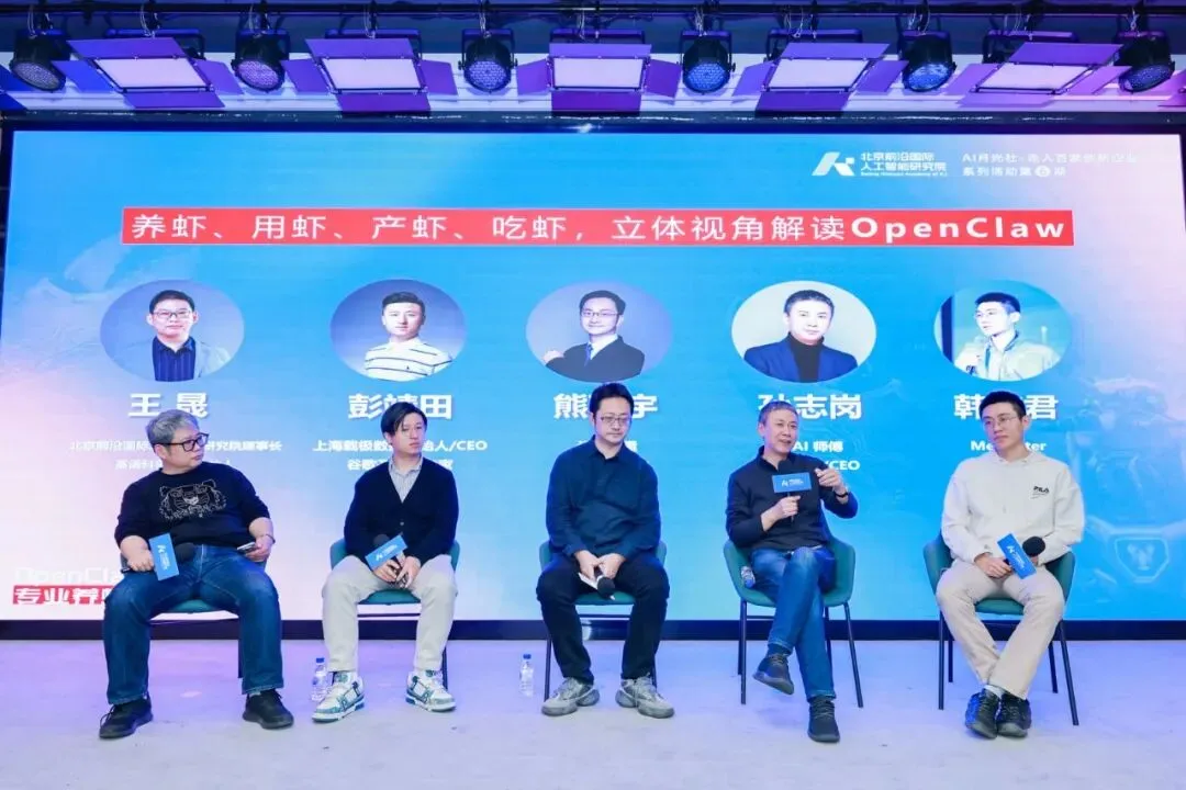 在圆桌环节,上海载极数据创始人/CEO、谷歌开发者专家彭靖田,记忆张量(上海)科技有限公司创始人兼CEO熊飞宇,AI师傅创始人/CEO孙志岗,Meowster联合创始人韩东君等嘉宾,在北京前沿国际人工智能研究院理事长王晟的主持下,围绕“养虾、用虾、产虾、吃虾,立体视角解读OpenClaw”展开深度讨论。
