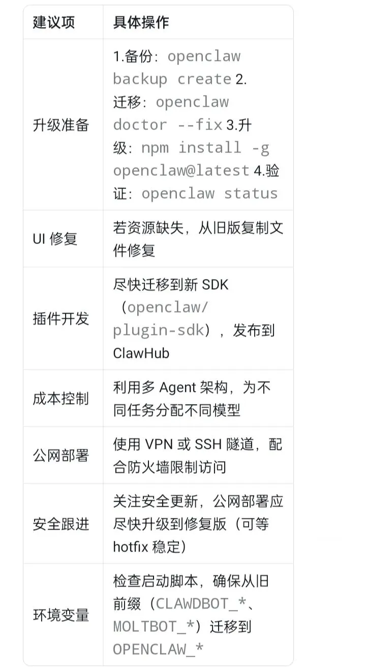 在 3.22 版本之前,OpenClaw 经历过 Clawdbot、Moltbot 两个曾用名,因此环境变量前缀曾经混乱不堪——有 CLAWDBOT_*、MOLTBOT_*、OPENCLAW_* 混用的情况。3.22 版本彻底统一为 OPENCLAW_*,旧前缀全部废弃。如果你在脚本或 systemd service 中使用了旧前缀,升级后必须手动修改,否则配置将失效。这也是本次升级中一个容易忽略的“坑”。