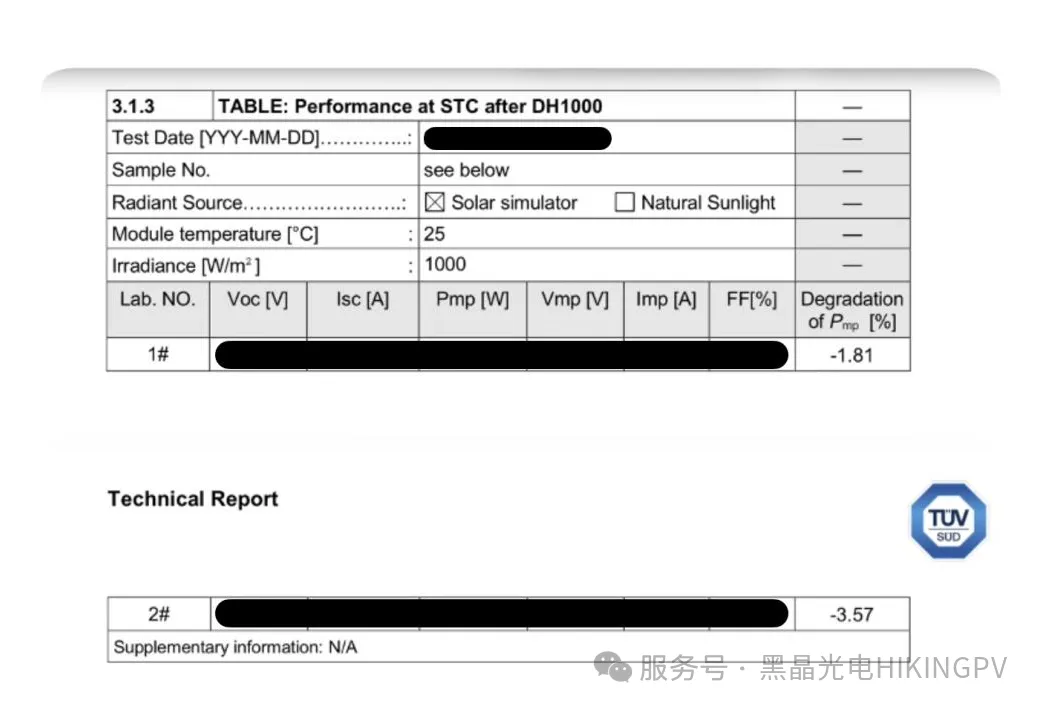 HIKING PV最新一代钙钛矿–晶硅叠层器件已通过第三方实验室可靠性测试,包括IEC61215 Damp Heat 1000小时湿热测试,功率衰减低于5%。