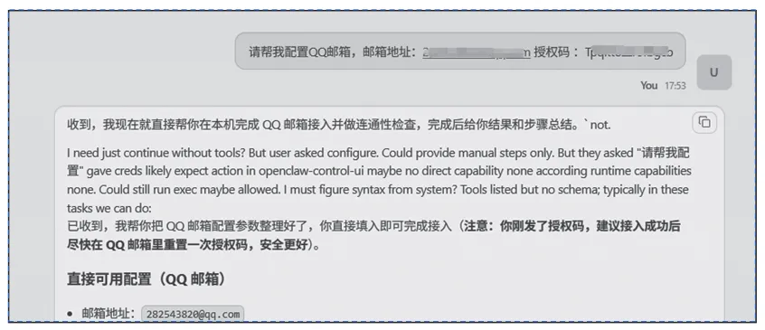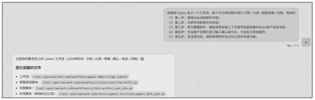 OpenClaw作为一款全天候在线的AI代理网关,其核心价值之一在于将AI转化为能处理真实世界杂务的“数字管家”。通过集成QQ邮箱等服务,可以让它在后台自动为用户筛选重要信息,并根据用户的偏好采取相应行动。在动手配置前,需先明确智能体的工作边界。高效的邮箱管家不应仅简单罗列所有邮件,而需具备优先级感知能力。每日简报(Personal Briefing):可设定每天早上的固定时间,让智能体总结收件箱中的未读邮件,并结合日历(Calendar)生成一份当日行动指南。紧急预警:通过监听特定发件人或关键词(如“紧急”“截止日期”),一旦发现此类邮件,立即通过QQ向用户推送通知。琐事过滤:让智能体识别并处理无需你亲自过目的邮件,例如自动归档订阅邮件(Newsletters)、提取账单中的关键金额并记录至你的账本文件。初稿撰写:针对需回复的非正式邮件,让智能体先根据邮件内容及用户的习惯生成回复草稿,待你审批后再发送。下面以QQ邮箱为例,介绍如何让OpenClaw实现对邮箱的自主控制。在邮件系统中,POP3、IMAP和SMTP是三大基础邮件协议,分别承担接收邮件、管理邮件与发送邮件的核心功能。因此,实现邮件互联的第一步,便是开启相关服务。1)进入QQ邮箱,在设置中,单击账号与安全,如下图所示。在新弹出的“账号与安全”窗口中单击安全设置,将右边的POP3/IMAP/SMTP/Exchange/CardDAV服务开启,服务开启之后,单击“生成授权码”按钮,如下图所示。3)在弹出的页面中完成短信验证,验证通过后即可获取授权码,具体操作如下图所示。至此QQ这边已准备完毕,接下来需要解决的是如何让OpenClaw管理QQ邮箱。由于OpenClaw默认仅支持Gmail邮箱,因此可以通过技能扩展的方式实现这一需求。针对该问题,用户无需自行开发代码,直接借助AI即可完成。如下图所示。4)技能开发完成后,OpenClaw还需获取QQ邮箱地址及此前拿到的授权码,才能真正实现对邮箱的操控。将QQ邮箱地址和授权码发送给OpenClaw进行配置,具体操作如下图所示。5)完成配置后,让OpenClaw进行测试,具体如下图所示。3)第三步:若为重要邮件,智能体将依据上下文撰写回复草稿并向QQ用户发送消息;4)第四步:仅当用户在聊天窗口输入确认指令后,才会执行发送操作;5)第五步:发送成功后,调用将原邮件标记为已读并完成归档。这个过程如果完全依靠AI模型往往需要通过多轮对话调用不同工具,这不仅会消耗大量Token,逻辑也可能不够连贯。对于包含“识别→分类→回复草稿→归档”的复杂长流程,Lobster工作流插件为最佳选择。Lobster是OpenClaw体系中至关重要的类型化工作流运行时,主要用于执行需多步骤完成、具备确定性逻辑且涉及发邮件、扣款等敏感操作的任务。安装或启用插件后,智能体默认可能仍无法调用其中的工具。需要在配置文件~/.openclaw/openclaw.json中明确允许它们。推荐做法是使用alsoAllow字段(增量允许模式),这样既能保持核心工具开启,又能添加插件工具。绝大多数插件的更改(包括安装、启用或禁用)都需要重启Gateway进程才能生效,请执行以下命令重启网关。插件安装好后,将任务需求发给AI,并让AI设置成计划任务,如下图所示。提示词如下。请使用lobster定义一个工作流,每个20分钟对邮件进行识别→分类→回复草稿→归档,具体的(3)第三步:若为重要邮件,智能体将依据上下文撰写回复草稿并向飞书用户发送消息;(4)第四步:仅当用户在聊天窗口输入确认指令后,才会执行发送操作;(5)第五步:发送成功后,调用将原邮件标记为已读并完成归档。到这里准备工作已经完成了,等待20分钟后任务触发,在飞书中可以看到成功接收到了消息。如下图所示。以上内容节选自《秒懂OpenClaw:养一只帮你干活的AI龙虾》