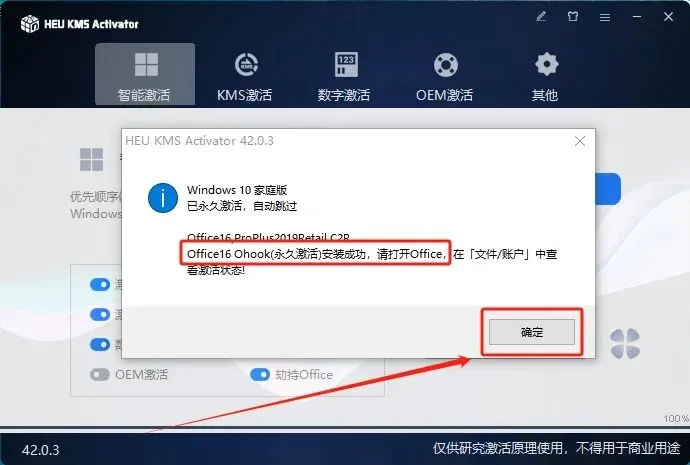 5.等待【Office2019】显示激活成功后,点击【确定】。