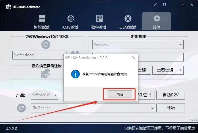 6.修复许可证弹窗:点击【其他】,产品选择【Office2019】,选择【Fix_Banner】,点击【开始】。