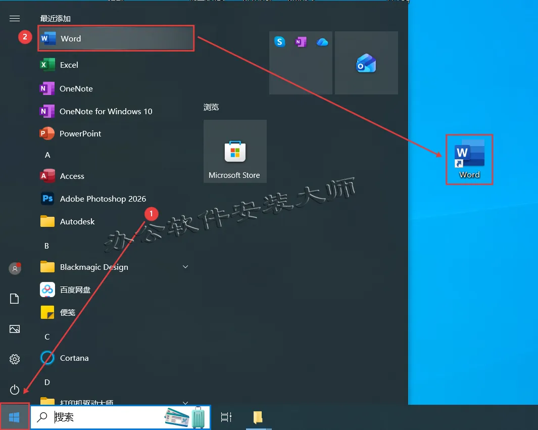 1.点击桌面任务栏中的【开始图标】点击【所有应用】将【Word】等拖到电脑桌面