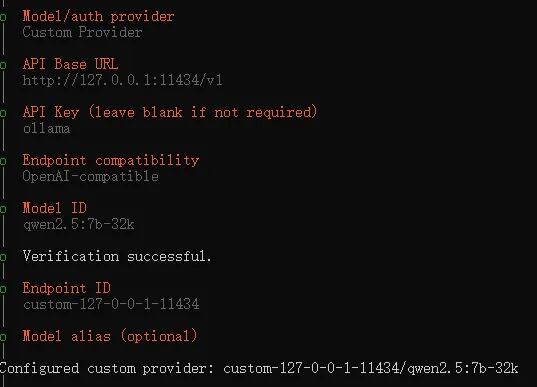 选择 Custom Provider,API URL填http://127.0.0.1:11434/v1,API Key可随意填(如ollama),模型ID填你刚创建的qwen2.5:7b-32k。