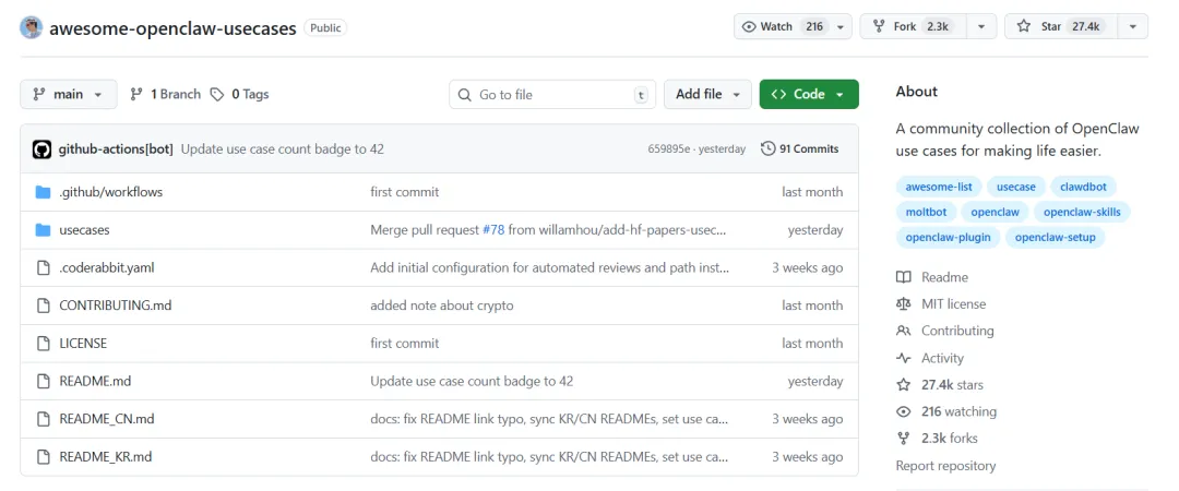 今天给大家推荐一个刚需项目:awesome-openclaw-usecases,一个专门收录 OpenClaw 真实落地场景的开源仓库,目前 GitHub Star 已破 27k+。