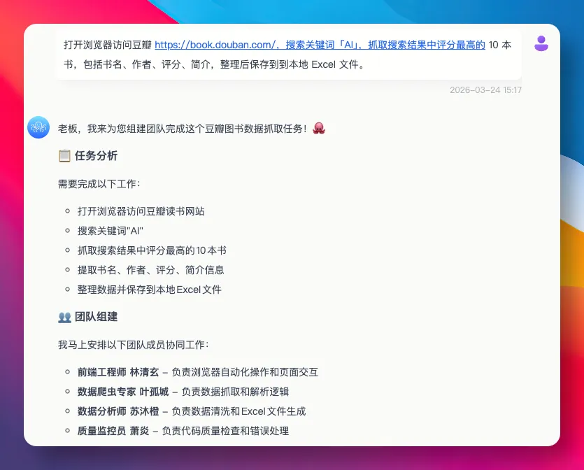 指令发出去后,它会组建一个专业 Agent 团队协同工作,有数据分析师、高级工程师、项目经理等角色,明确分工后便开始行动。