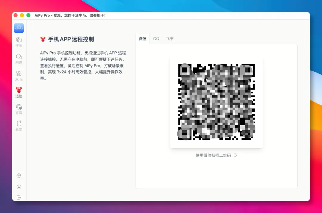 AiPy 最新版本 0.14.3 还支持飞书、QQ、微信三端远控。