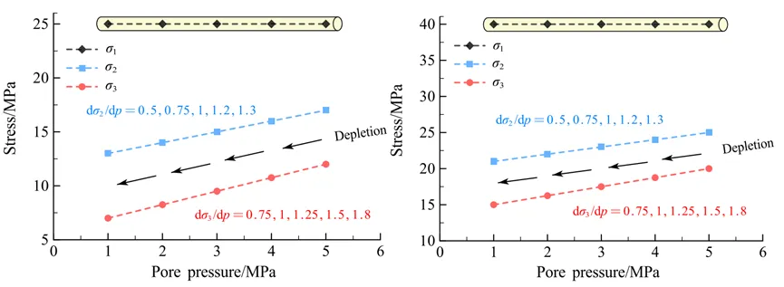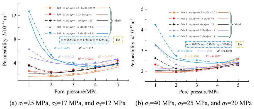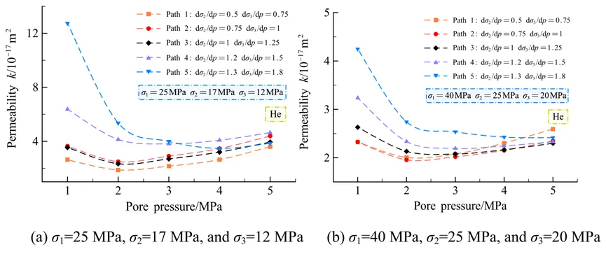 图2He抽采过程中不同dσ2/dp与dσ3/dp下的渗透率演化