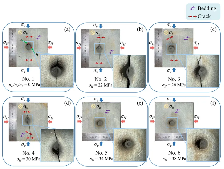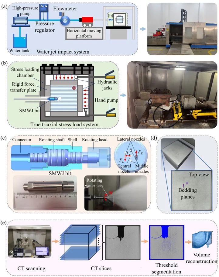 水力喷射钻井技术因其低成本、高效率,在地热和非常规天然气开发中具有重要应用价值。自旋式多喷嘴水射流钻头因其能够形成圆形钻孔、提高钻孔稳定性而成为该技术的核心工具。然而,实际储层中的砂岩多具有层理结构,且处于复杂的真三轴地应力状态,现有研究多集中于无应力条件下的均质砂岩,忽略了地应力与层理共同作用下钻孔破坏机制的复杂性。尤其在层理面与主应力方向不同时,钻孔的几何形态和破坏模式会发生显著变化。因此,亟需开展真三轴应力条件下自旋式多喷嘴水射流在层状砂岩中的钻孔特性研究,以揭示其破坏机制,为工程应用提供理论指导。