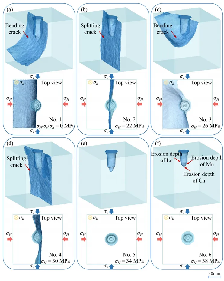 研究结果表明,真三轴应力条件下,自旋式多喷嘴水射流在层状砂岩中钻孔的几何参数随应力增大而显著减小,其中钻孔深度最大降幅达34.8%,侵蚀深度最大降幅为17.9%,直径最大降幅为19.2%,体积最大降幅高达75.2%。钻孔破坏形式主要表现为沿层理面的张拉破裂和压缩破坏,张拉破裂由应力波叠加效应引发,压缩破坏则由地应力重分布导致。应力波叠加效应分为自叠加与互叠加两种形式,是张拉裂纹萌生的主要原因,而水楔效应则进一步促进裂纹的扩展。当层理面垂直于最大主应力方向时,钻孔更易发生沿层理面的张拉破坏。研究成果为深部层状砂岩储层中水力喷射钻井的形态预测与工艺优化提供了理论依据。