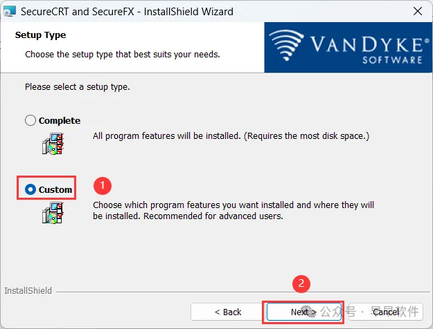 8、勾选【Custom】,再点击【Next】