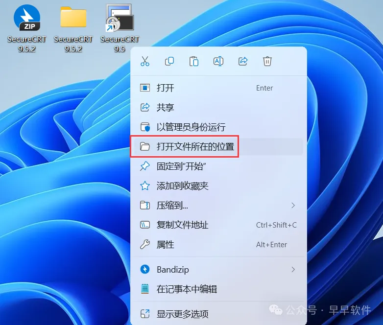 16、回到桌面,右键桌面上的【SecureCRT 9.5软件图标】,点击【打开文件所在的位置】