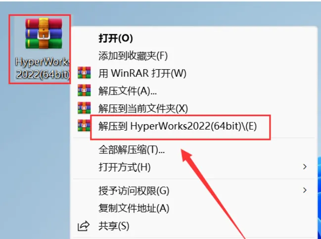 1.解压安装包:鼠标右击【HyperWorks2022(64bit)】压缩包,选择电脑上安装的解压软件,点击【解压到HyperWorks2022(64bit)】。