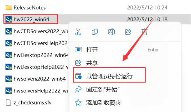 3.鼠标右击【hw2022win64】选择【以管理员身份运行】。