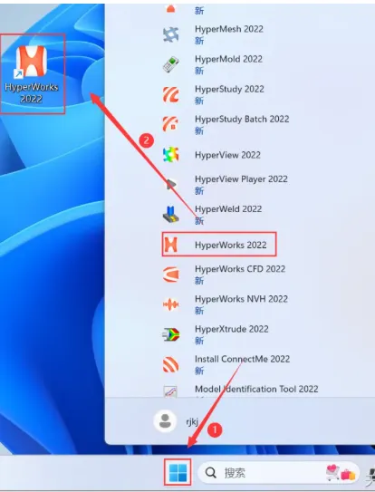 15.创建桌面快捷方式:①点击桌面任务栏中的【开始图标】>点击【所有应用】>双击展开【Altair 2022】文件夹②将【HyperWorks 2022】图标拖到电脑桌面。