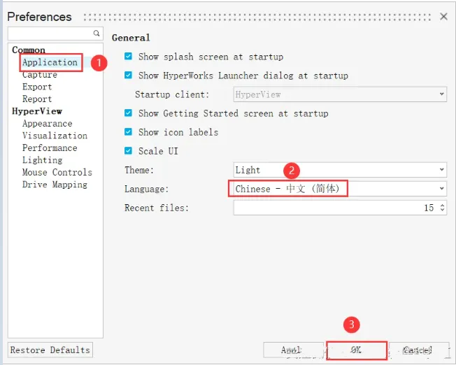 26.中文修改:①点击【Application】②选择【中文简体】③点击【OK】(重启软件即是中文)