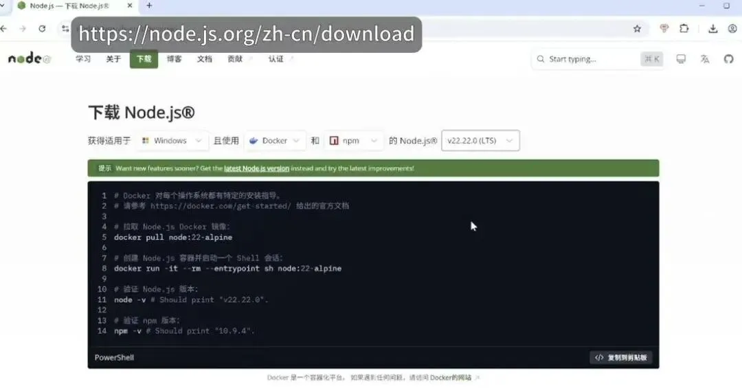 打开浏览器,访问 Node.js 官网(https://nodejs.org/zh-CN/download/current/)下载22.x及以上版本