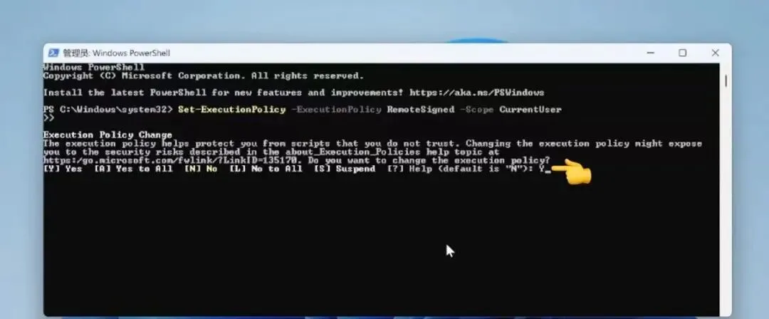 为了避免powershell默认策略太严格,导致各种安装报错,这里一定要输入:Set-ExecutionPolicy RemoteSigned -Scope CurrentUser后按Enter回车键,这时powershell会出现一个提示,问我们是否修改执行策略?