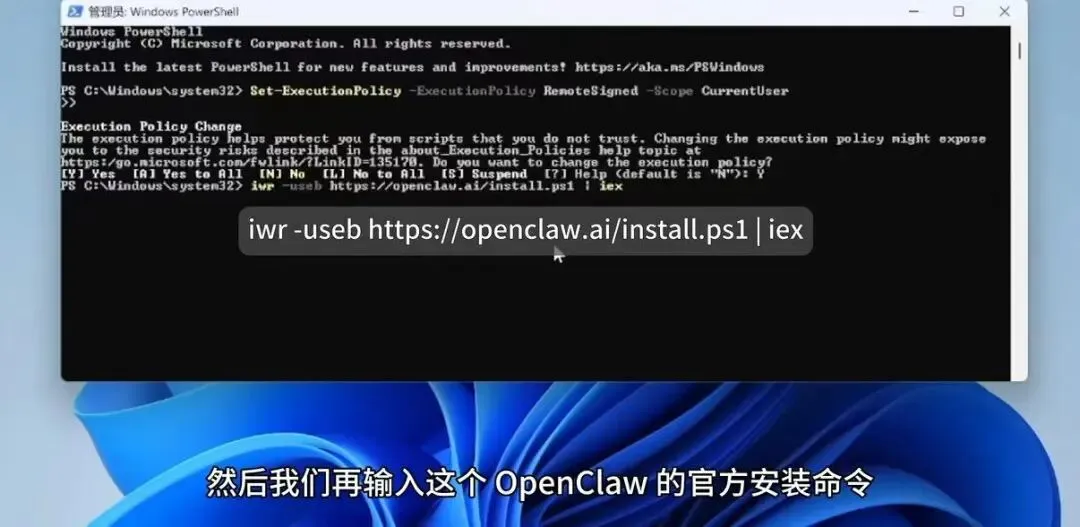 这里直接填写Y,代表同意,继续Enter回车键,然后就会让你输入openclaw的安装网址:iwr -useb https://openclaw.ai/install.ps1 | iex