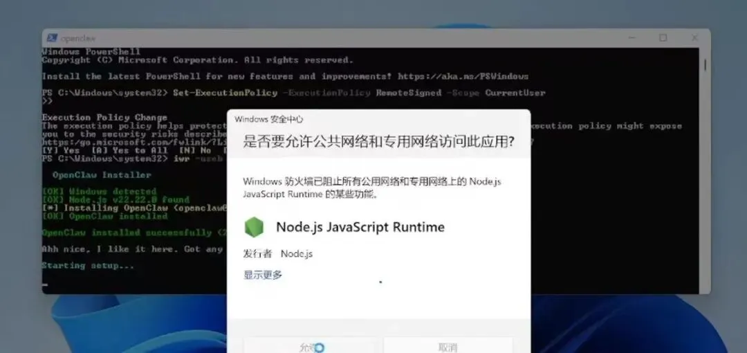 如果中途出现弹窗一定要点允许,当你看到一段openclaw installed successfully,就代表安装成功啦,不过这里还没完。