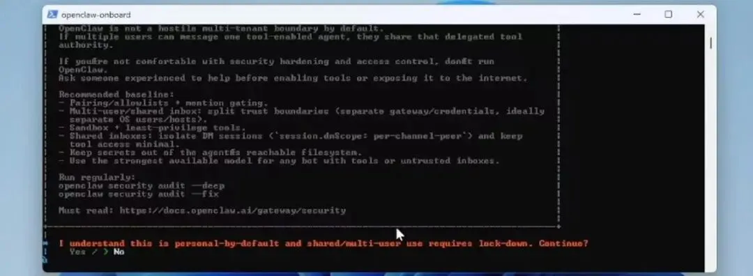 这里open claw会展示一段使用它科能存在风险的话,问你是否继续,要在键盘的向左按钮里选择左键选择yes,然后按回车继续,选择保持默认的【quickstart模式】后,继续回车,进入大模型服务商配置阶段