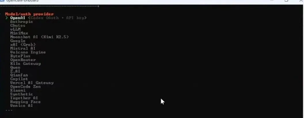 这里会有很多选择,像国外的大模型服务商openai之类的,也有国内的大模型服务商Minimax或者Kimi、Qwen之类的,这个可以根据个人偏好选择,用键盘的上下方向键进行切换,如果自己已经有创建好的某个大模型服务商的API密匙,可以直接选择用的,而我用的是minimax的,