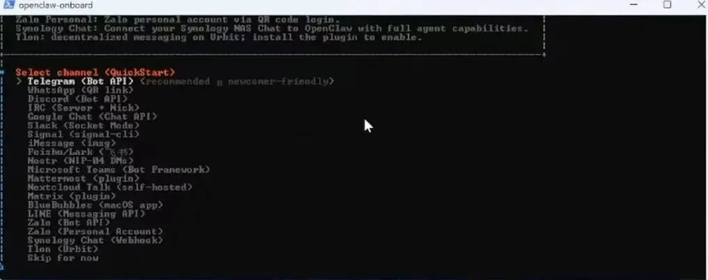 也就是我们通过哪种通讯渠道和小龙虾对话,在这里,我们可以先选择跳过【skip for now】等飞书准备步骤准备好后再重新配置通讯