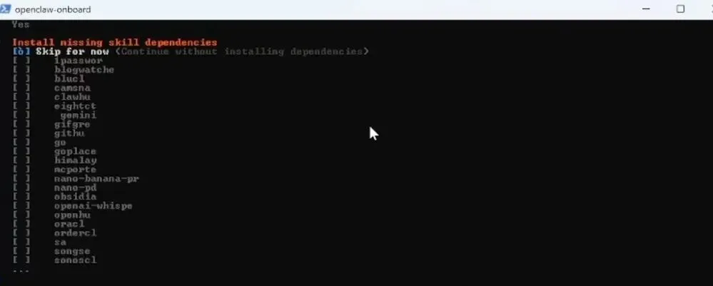 然后回车后会问我们现在要不要配置Skills,也就是小龙虾的技能