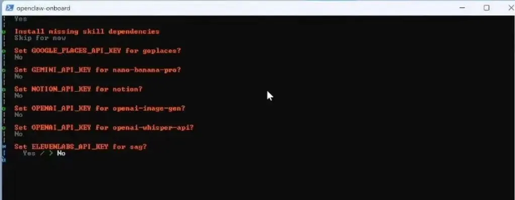 然后回车,接下来会出现一系列问题,问我们要不要配置各种服务的API密匙,如果我们还没有创建好,这里可以一路都先点no,等后面有需要时再进行填写