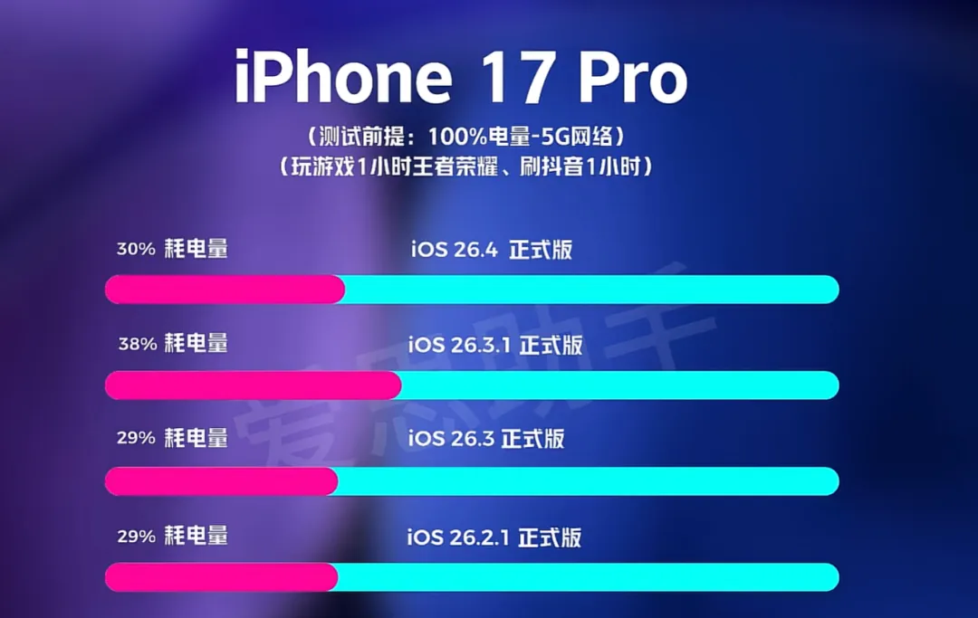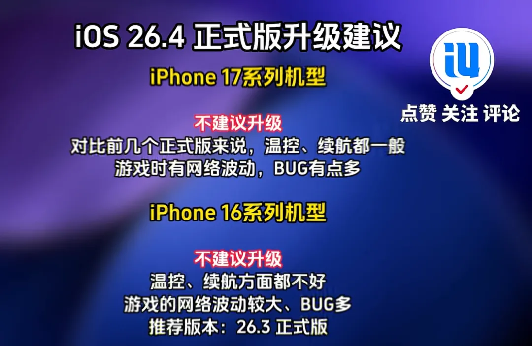 2026年3月25日,iOS 26.4 正式版上线,页面写着二十多项新功能和游戏性能优化,夜里有人第一时间装上去,白天各个数码论坛和社交群里开始刷屏,耗电快、发热重、信号不稳、游戏掉帧,这些词挤在一起滚动,截图一张接一张,机型从 iPhone 13 到 17 都能看到反馈,节奏很快,问题指向也很集中。