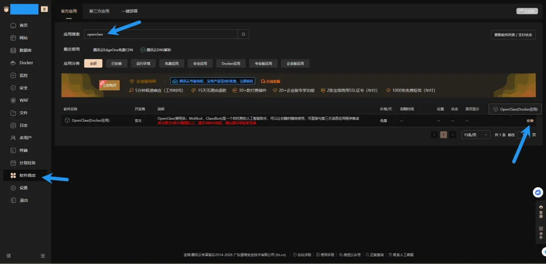 安装完成后,点击软件商店,搜索 openclaw ,点击安装
