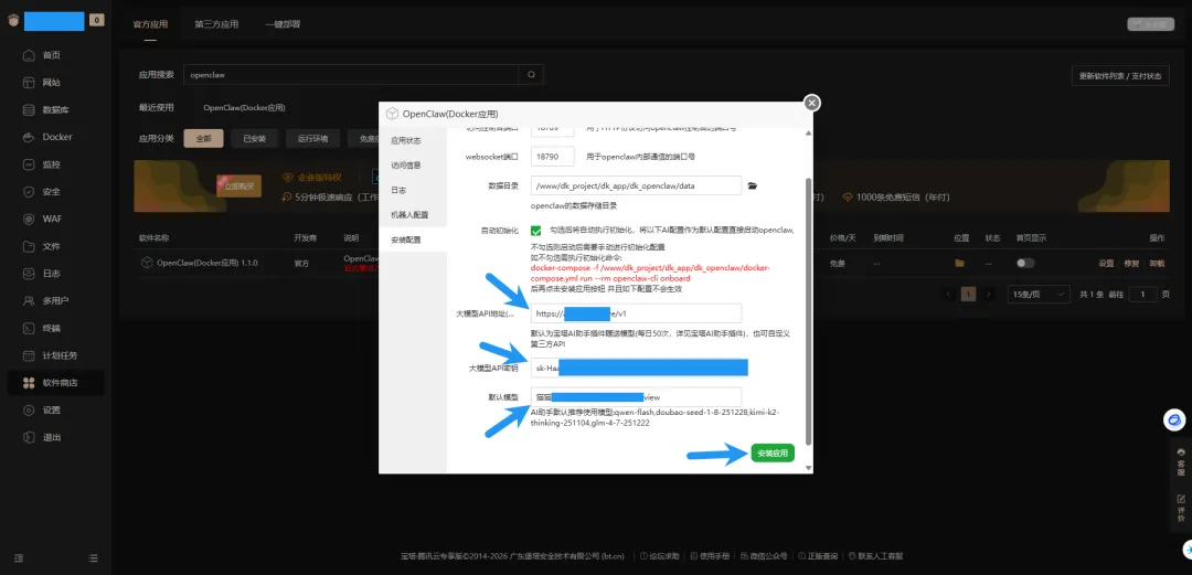 根据自己的实际情况,填写相关信息,点击安装应用(如果你有大模型官方 API,请自行设置接入,这里不做赘述)