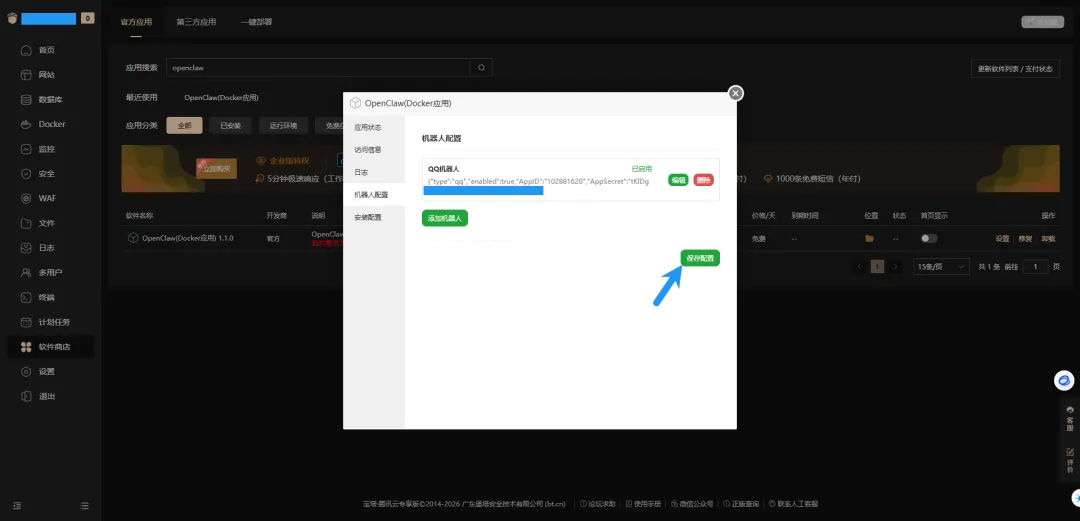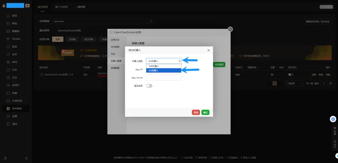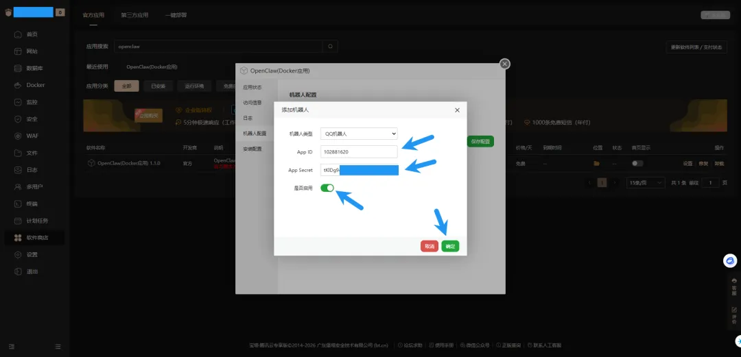 回到宝塔面板,填入上面复制的 App ID 和 App Secret,点击启用,点击确定