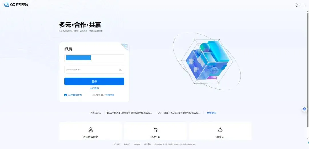 访问 QQ 开放平台 https://q.qq.com/ ,如果你尚未注册过,需要先注册账号(需要实名信息,扫脸,以及一个 QQ 号作为管理员 QQ 号),非常简单,这里就不赘述了