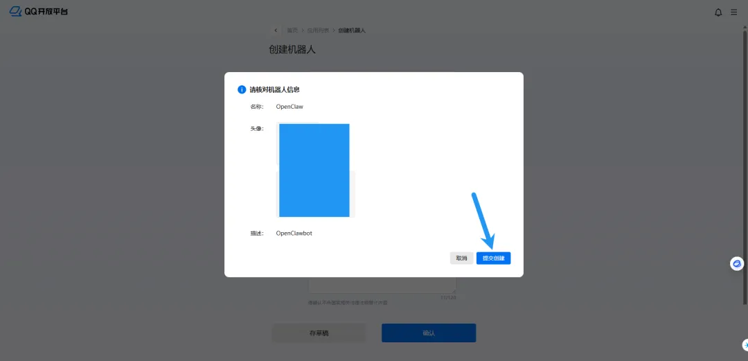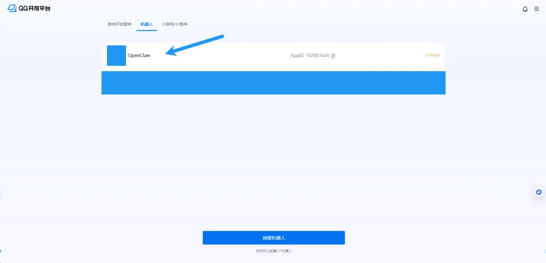 登录你的 QQ 开放平台账号,进入后台后,点击机器人,点击创建机器人