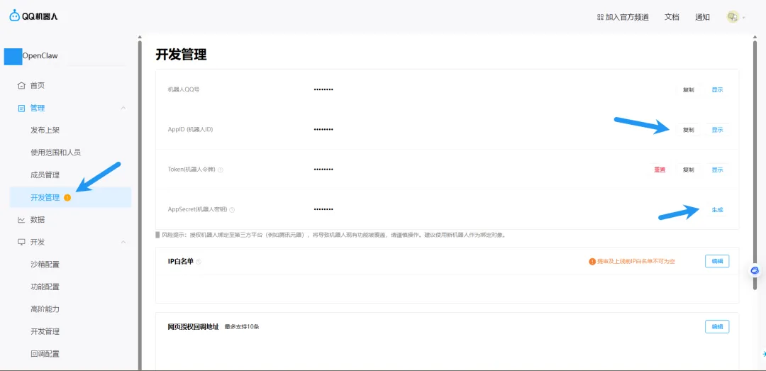 点击开发管理,复制 App ID,生成 App Secret