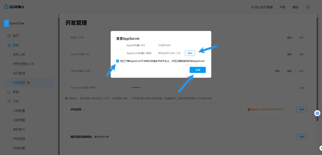 扫码认证后,复制 App Secret,勾选,点击关闭