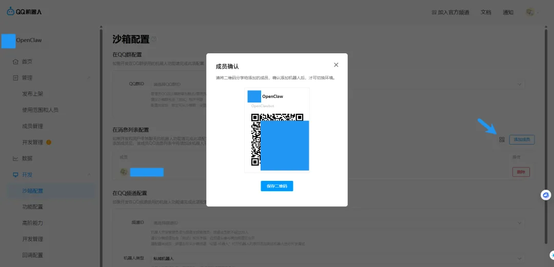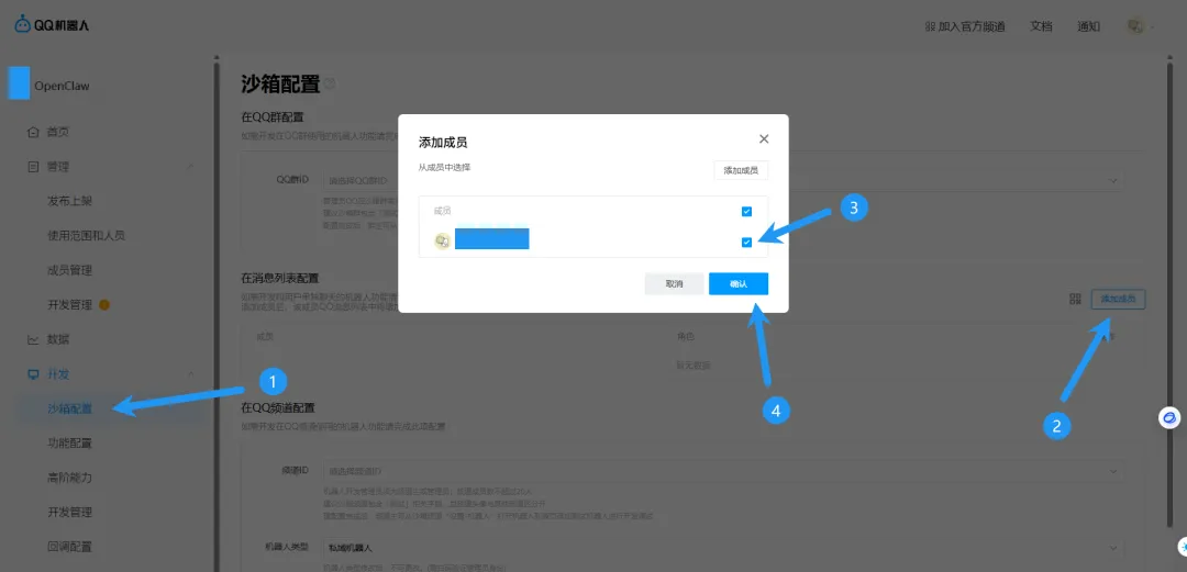点击沙箱配置,点击添加成员,把自己勾选上,点击确认
