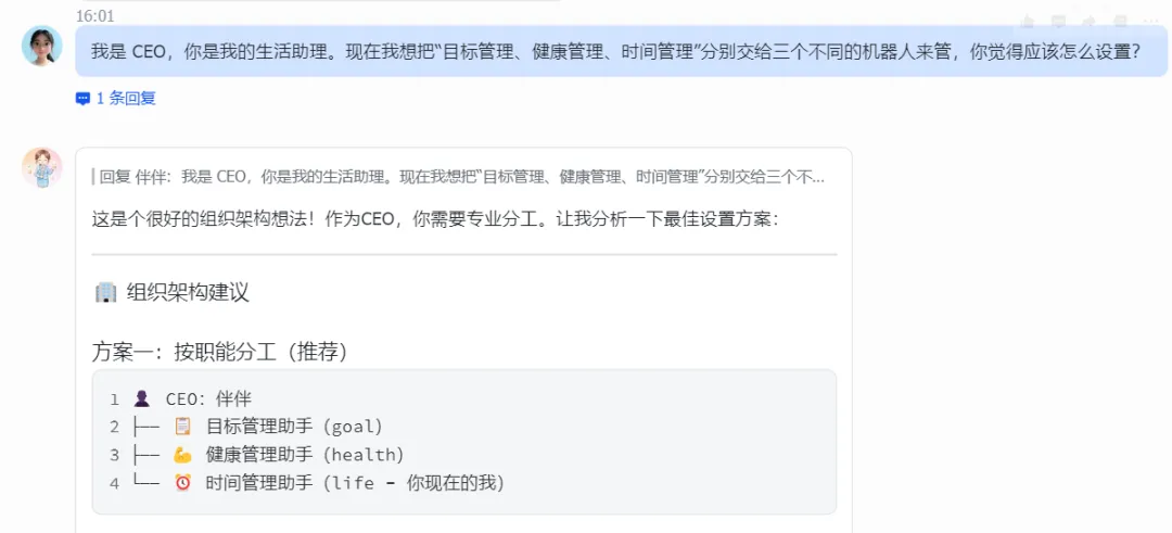我是 CEO,你是我的生活助理。现在我想把"目标管理、健康管理、时间管理"分别交给不同机器人来负责,你帮我设计一套方案。
