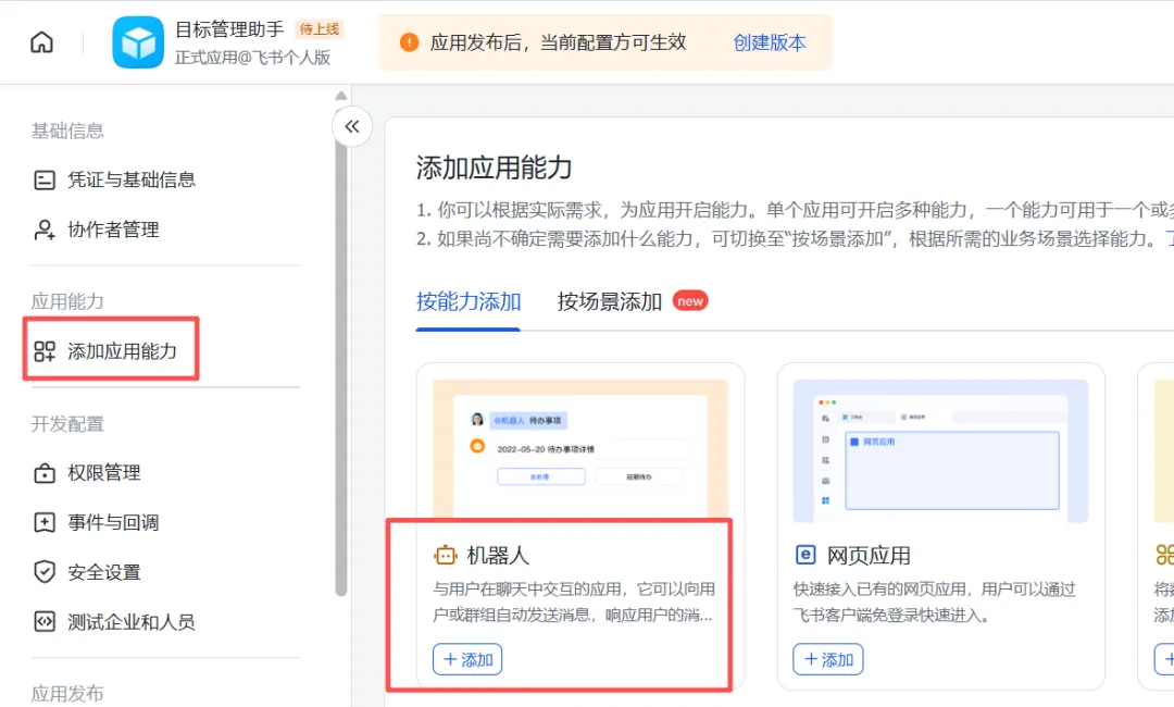 选择"添加应用能力"——添加"机器人"