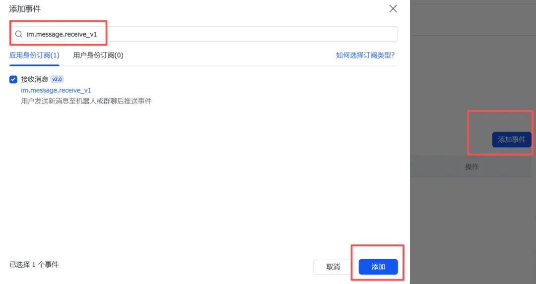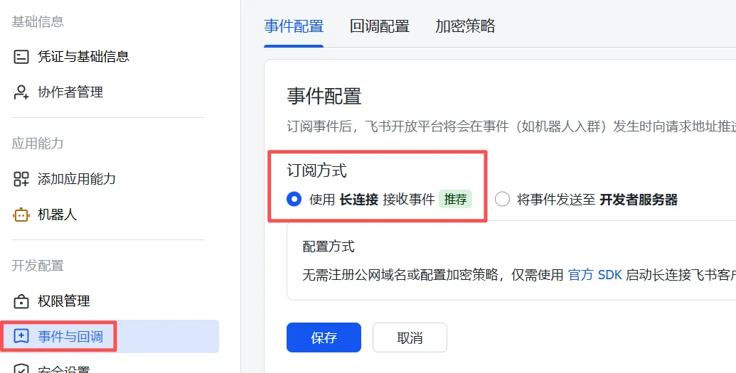 • 订阅方式:事件与回调均选择"长连接"