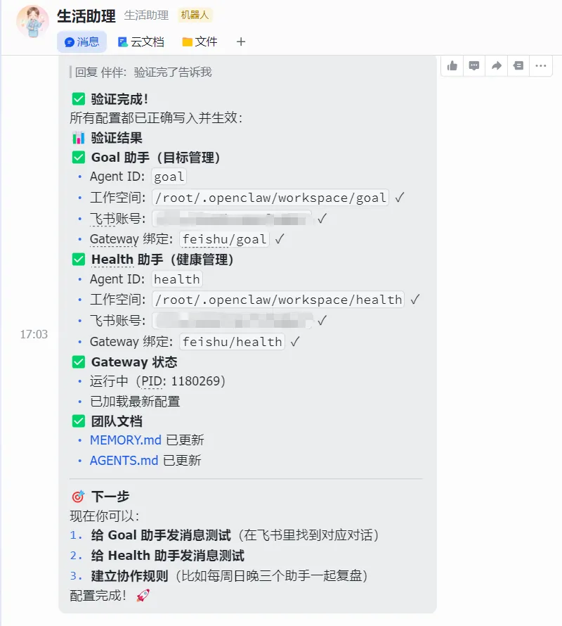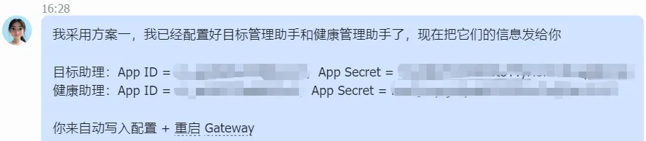 现在,把子机器人的App ID 和 Secret 发给"生活助理",让它进行配置并重启Gateway