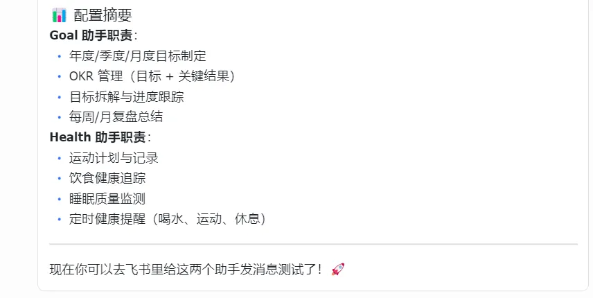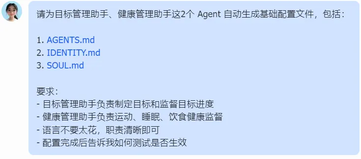 请为目标管理助手、健康管理助手生成配置文件:AGENTS.md / IDENTITY.md / SOUL.md要求:- 目标管理助手负责制定目标和监督进度- 健康管理助手负责运动、睡眠、饮食- 职责清晰,不要太花- 配置完成后告诉我如何测试是否生效