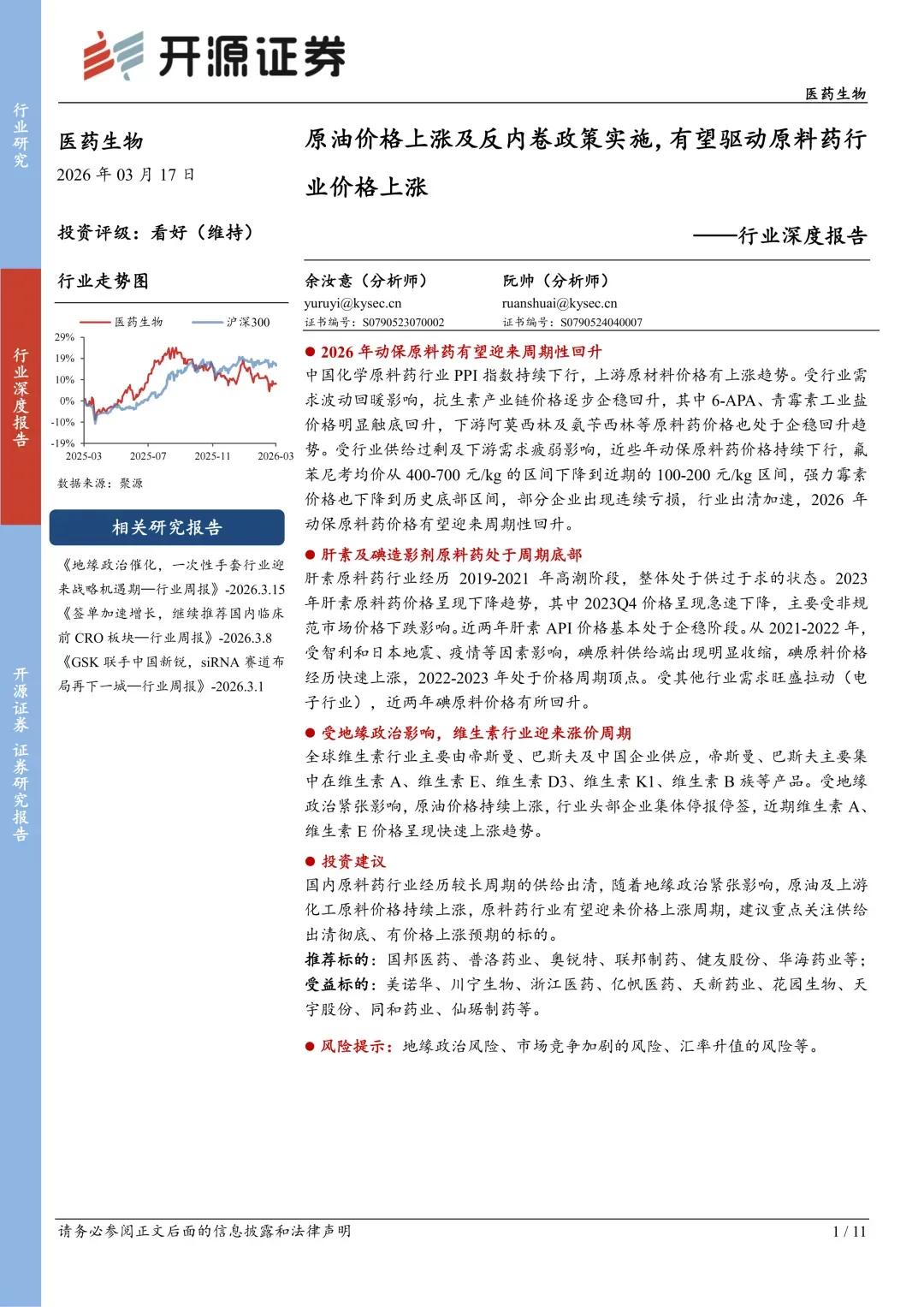 中期(6-12个月):关注业绩兑现,优选一体化程度高、成本控制好的龙头(如川宁生物、普洛药业)。