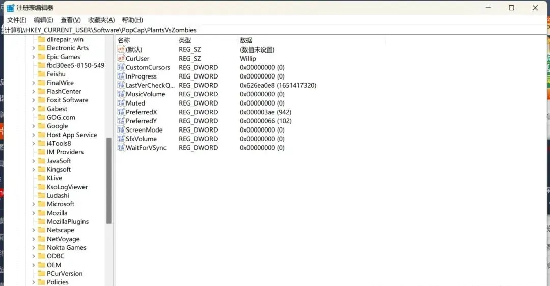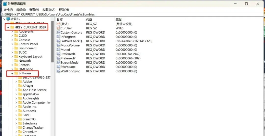 依次点击计算机→HKEY_CURRENT_USER→软件→PopCap→PlantsVsZombies: